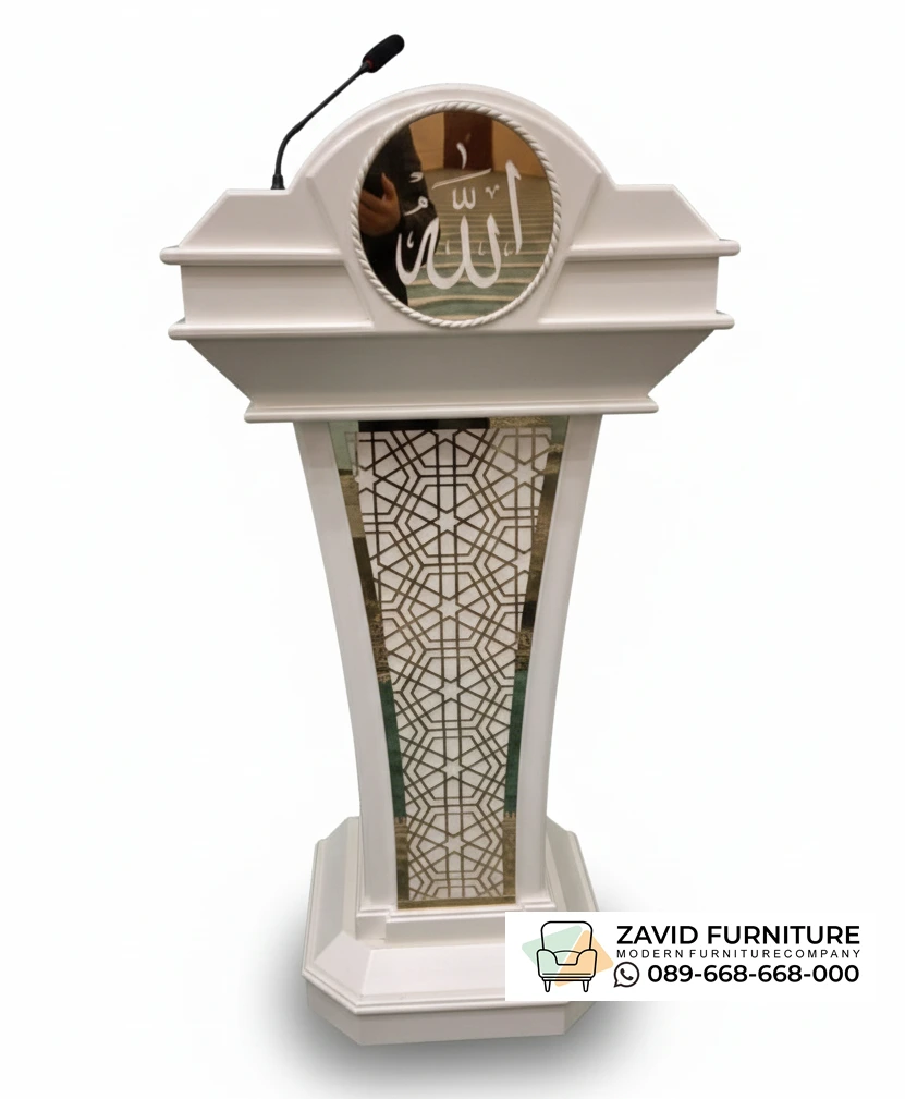Jika pada umumnya podium masjid dibuat dengan warna natural agar serat kayu jati tetap terlihat namun berbeda denga produk buatan kami saat ini bahwa kami membuat podium masjid dengan finishing warna putih. Podium Masjid Sumenep finishing warna putih melambangkan kesucian, kebersihan, kemurnian, dan ketenangan, sangat sesuai dengan suasana masjid. selain itu, warna putih memantulkan cahaya sehingga area lebih terang, serta menampilkan kesan elegan dan profesional, menjadikannya pilihan klasik yang selalu relevan dan memperindah tampilan masjid.