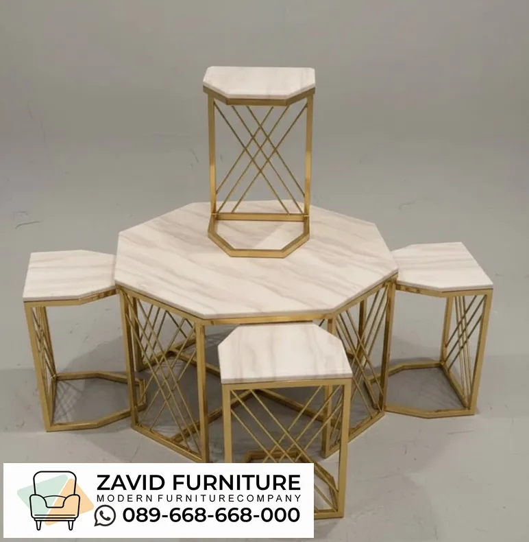 Kali ini kita ada set meja yang cukup unik, yaitu set meja stainless oktagon yang merupakan kumpulan meja (yang umumnya terdiri dari meja dan kursi) dengan desain kerangka berbentuk pola segi delapan (oktagon) dan memanfaatkan bahan stainless steel sebagai struktur utamanya. Bentuk oktagonnya memberi kesan unik, modern, dan artistik.