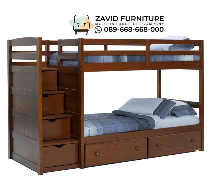 Dibuat dengan menggunakan kayu jati asli yang dikenal sebagai kayu berkualitas tinggi. Kayu jati terkenal karena daya tahannya terhadap serangan serangga, jamur, dan perubahan cuaca, sehingga tempat tidur ini dijamin kuat dan tahan lama selama bertahun-tahun. Desainnya sangat cerdas untuk memaksimalkan ruang di kamar yang terbatas. Setiap anak tangga memiliki fungsi sebagai laci penyimpanan yang luas untuk menyimpan mainan, buku, atau pakaian. Di bagian bawah tempat tidur utama terdapat dua laci besar untuk penyimpanan tambahan seperti sprei atau selimut.