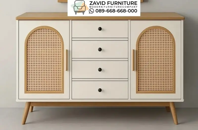 Kabinet ini tidak hanya berfungsi sebagai tempat penyimpanan, tetapi juga sebagai komponen dekorasi utama di ruang tamu atau kamar tidur. Sangat cocok untuk tema rumah Japandi, Skandinavia, maupun Modern Minimalis.
