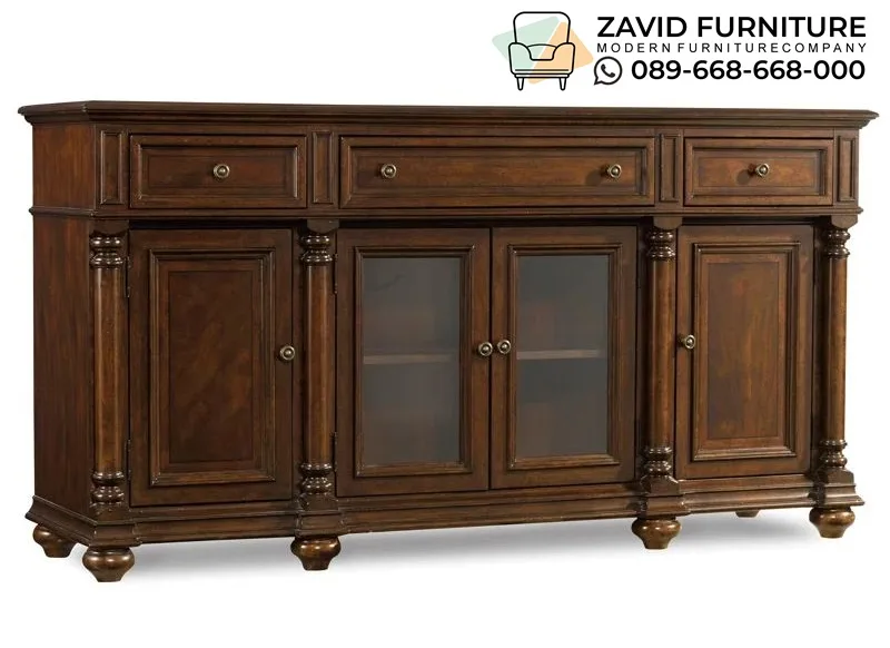 Terbuat sepenuhnya dari Kayu Solid pilihaan yang memastikan kekuatan untuk bertahan selama bertahun-tahun. Serat kayu yang alami memberikan keunikan pada setiap unit. Dilengkapi dengan detail tiang penyangga yang diputar dan kaki pendek yang kokoh, kabinet ini terlihat megah seperti furniture kerajaan. Terdapat penyimpanan yang maksimal dengan tiga laci di bagian atas, ruang pintu kayu di tengah, dan ruang pintu kayu di samping.