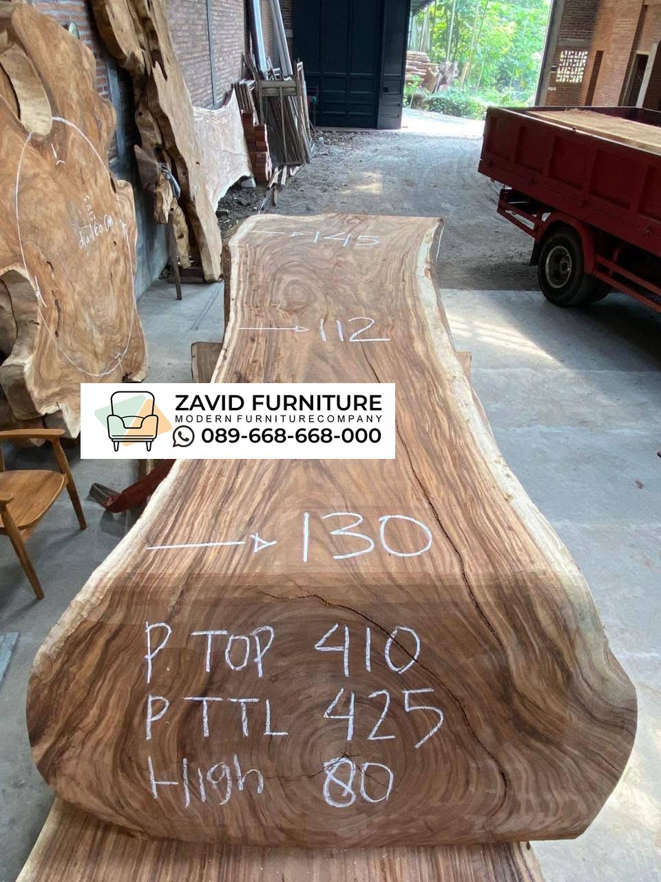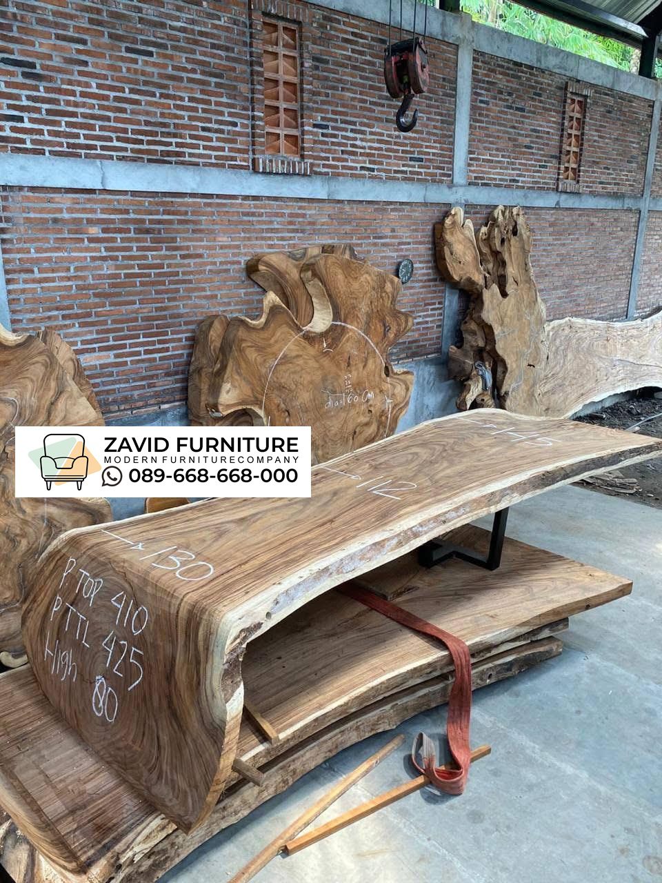 Kali ini bentuk kaki L dipadukan dengan meja dari kayu trembesi yang terkenal kuat, kokoh, dan besar. Kayu trembesi dikenal dengan ketahanan dan ketebalannya, sehingga meja yang dibuat dari trembesi akan sangat kokoh dan tahan lama. Kayu trembesi memiliki serat alami yang memukau dan warna kayu yang hangat, sehingga meja trembesi akan menjadi pusat perhatian di ruangan. Sentuhan akhir yang halus pada meja trembesi melindungi permukaan kayu dari goresan, menjaga keaslian karakter kayu. Kayu trembesi juga mudah dibentuk dan dikerjakan, memungkinkan berbagai gaya dan desain, mulai dari modern hingga tradisional.