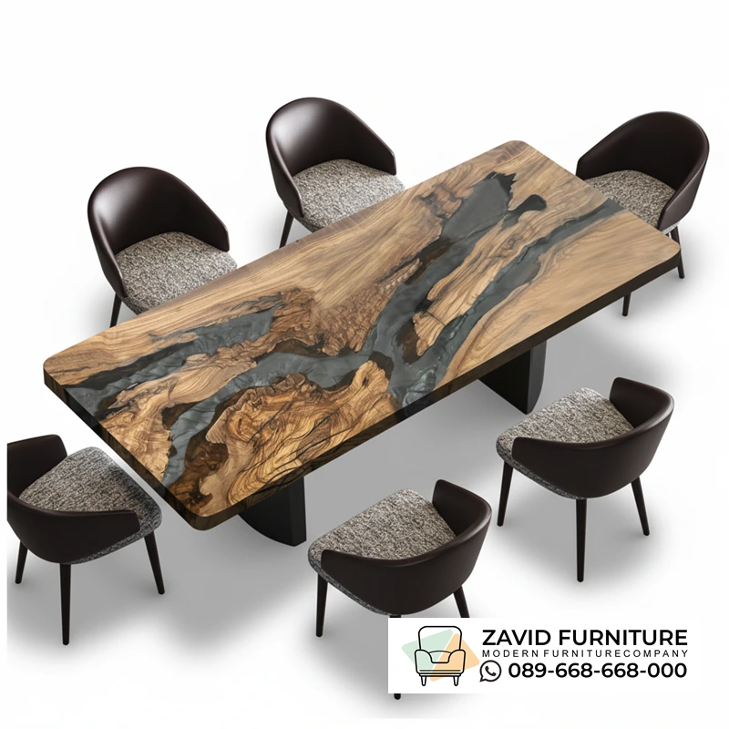 Meja makan kali ini memilki tampilan yang lebih unik lagi jika dibandingkan dengan meja kayu jati biasanya. Produk model Meja Jati Resin dipadukan dengan bahan resin atau epoxy yang mampu menghadirkan nuansa yang cantik, unik serta elegan pada serta tampilan agar dapat memikat perhatian bagi siapapun yang melihatnya.