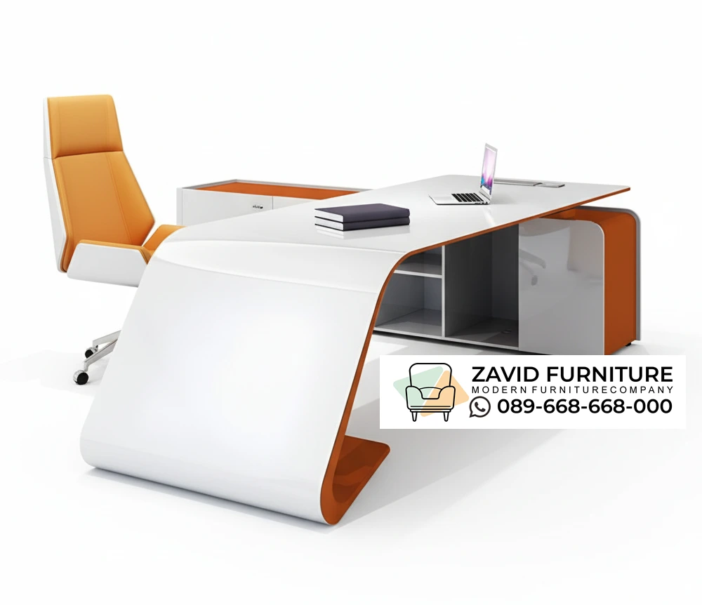 Meja kerja kali ini memiliki bentuk menyerupai bentuk L sehingga lebih terlihat modern seakan akan tidak memiliki kaki meja, selain bentuknya yang unik meja kantor ini juga dilengkapi dengan laci yang bisa digunakan untuk dokumen, arsip, atau area tempat penyimpanan, kabinet kecil, atau area kabel tersembunyi, sehingga tampilan meja tetap rapi dan tertata. Meja berbentuk L tidak hanya unggul dalam fungsionalitas tetapi juga dalam estetika dan ketertiban.Meja berbentuk L dapat membantu menyembunyikan kabel yang berantakan dan peralatan kantor, menjaga lingkungan kerja yang bersih dan terorganisir.Ini mengurangi kekacauan desktop, meningkatkan daya tarik visual kantor secara keseluruhan.