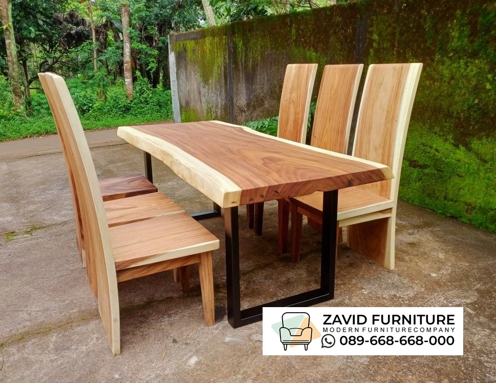 Meja dari bahan kayu dapat terbuat dari beberapa bahan seperti trembesi, kayu jati. namun untuk harga meja dari bahan kayu jati cenderung lebih mahal sebab sekarang ini sudah banyak yang ditebang untuk dijadikan furniture atau tempat wisata dan pertumbuhan kayu jati sendiri terbilang cukup lama, sehingga sekarang ini banyak yang menggunakan bahan kayu trembesi. Kayu trembesi ( Albezia saman ) adalah salah satu jenis kayu yang populer di Indonesia. dengan guratan serat yang cantik dan warna yang menarik, jenis kayu ini sering di gunakan untuk berbagai keperluan. Salah satunya perabotan rumah tangga, ke unikan dari kayu ini terletak pada pola seratnya yang elegan dan alami. Makanya banyak sekali para pengrajin mebel yang memilih dan menggunakan bahan dari jenis kayu trembesi solid ini salah satunya. dengan bentuknya yang sangat gelondongan utuh dan juga tebal akan membuat meja makan ini sangat kokoh serta tahan lama. Dengan setelan meja makan ini pastinya akan membuat ruangan rumah makan anda terlihat sangat minimalis elegant dengan warna cantik yang di miliki dari serat-serat kayu trembesi solid ini. maka, tidak heran jika kayu trembesi sering dipilih sebagai pengganti kayu jati karena harganya yang lebih murah serta memiliki daya tahan yang hampir mirip dengan kayu jati.