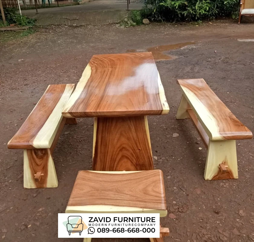 Meja dari bahan kayu dapat terbuat dari beberapa bahan seperti trembesi, kayu jati. namun untuk harga meja dari bahan kayu jati cenderung lebih mahal sebab sekarang ini sudah banyak yang ditebang untuk dijadikan furniture atau tempat wisata dan pertumbuhan kayu jati sendiri terbilang cukup lama, sehingga sekarang ini banyak yang menggunakan bahan kayu trembesi. Kayu trembesi ( Albezia saman ) adalah salah satu jenis kayu yang populer di Indonesia. dengan guratan serat yang cantik dan warna yang menarik, jenis kayu ini sering di gunakan untuk berbagai keperluan. Salah satunya perabotan rumah tangga, ke unikan dari kayu ini terletak pada pola seratnya yang elegan dan alami. Makanya banyak sekali para pengrajin mebel yang memilih dan menggunakan bahan dari jenis kayu trembesi solid ini salah satunya. dengan bentuknya yang sangat gelondongan utuh dan juga tebal akan membuat meja makan ini sangat kokoh serta tahan lama. Dengan setelan meja makan ini pastinya akan membuat ruangan rumah makan anda terlihat sangat minimalis elegant dengan warna cantik yang di miliki dari serat-serat kayu trembesi solid ini. maka, tidak heran jika kayu trembesi sering dipilih sebagai pengganti kayu jati karena harganya yang lebih murah serta memiliki daya tahan yang hampir mirip dengan kayu jati.