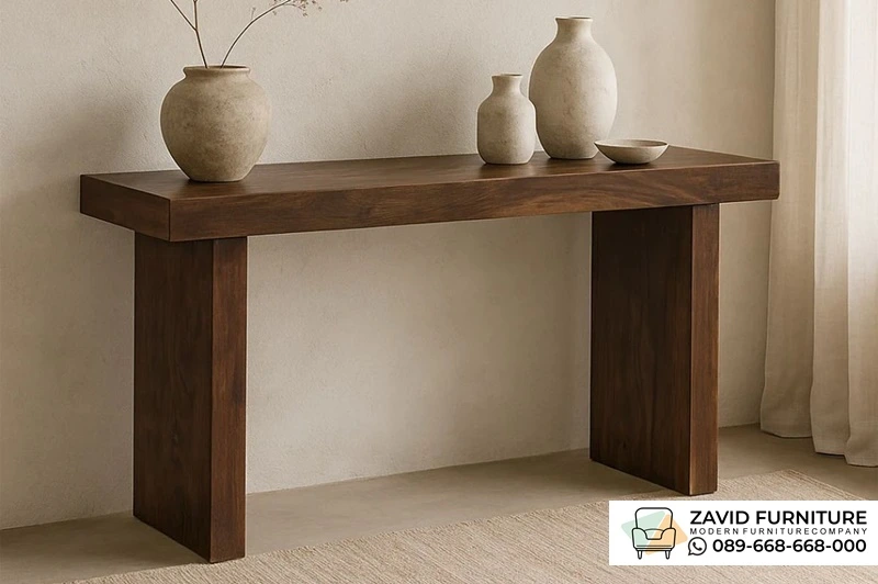 Meja Konsul Slab Solid Premium ini membawa ide Wabi-sabi dan gaya Modern-Industrial yang menekankan pada kesederhanaan serta keindahan alami. Dibuat dari bahan kayu solid berkualitas tinggi dengan potongan slab yang tebal, meja ini memberikan ketahanan jangka panjang dan stabilitas yang kuat.
