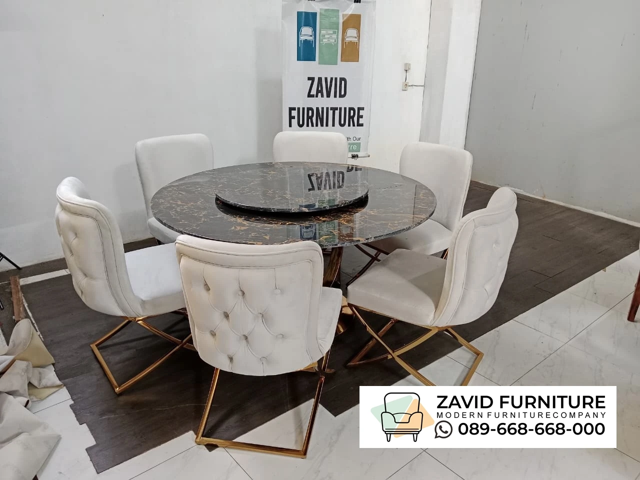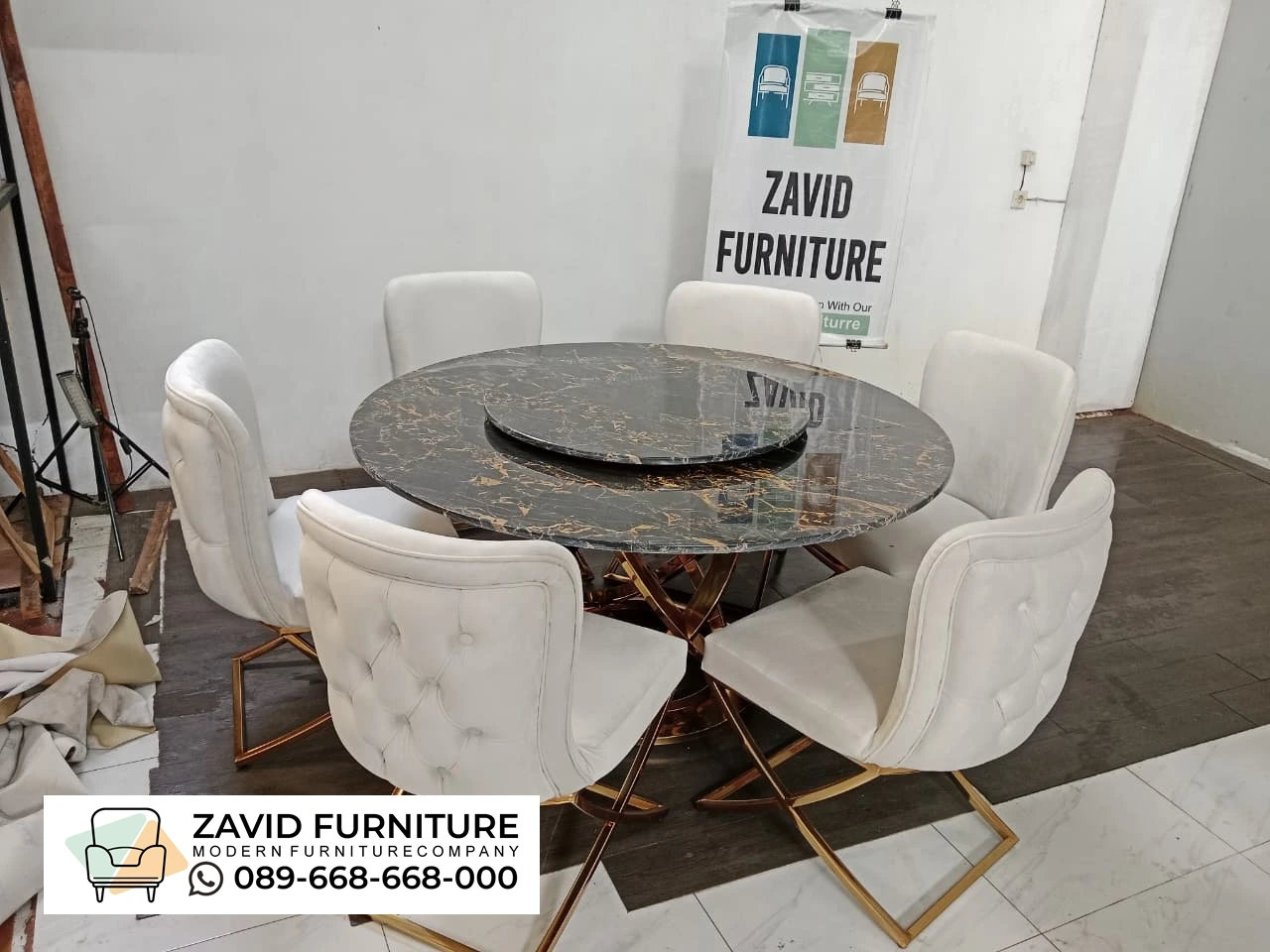 Meja Makan yang terbuat dari bahan marmer dengan bentuk bulat utuh seperti pada gambar menjadi pilihan sempurna untuk Anda yang ingin menghadirkan nuansa mewah dan modern dalam ruang makan. Dengan permukaan marmer yang elegan dengan empat hingga enam kursi bahkan juga 10 kursi yang nyaman, set meja makan ini tidak hanya menawarkan keindahan visual, tetapi juga kenyamanan untuk menikmati setiap momen makan bersama keluarga atau tamu. Desain yang klasik namun kontemporer, menjadikan meja makan ini cocok untuk berbagai gaya interior, dari yang minimalis hingga yang modern bahkan rustik.