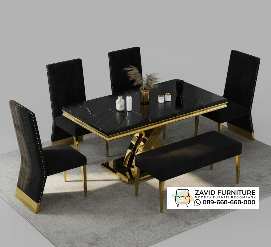 Granit hitam dapat membuat suasana meja makan lebih terlihat glamor dan elegant apalagi jika dipadukan dengan bahan stainless gold yang tentunya membuat meja makan semakin modern. Meja Makan Granit Hitam Secara fungsional, granit hitam sangat kuat dan tahan panas, sehingga aman untuk meletakkan piring atau hidangan panas langsung di atasnya. Selain itu, bahan granit ini anti gores, tidak mudah retak, dan tidak menyerap cairan, sehingga meja tetap terlihat baru walau digunakan setiap hari. cara membersihkanya pun mudah hanya dengan kain lembap, permukaan akan kembali berkilau seperti baru.