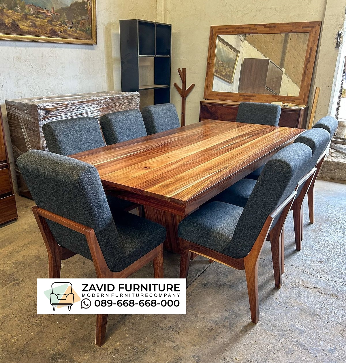 Meja Makan Jati Jepara ini di produksi langsung dari kota jepara dibuat dari bahan kayu utuh tanpa sambungan sehingga lebih kokoh dan juga memiliki nilai estetika di samping fungsi utamanya, tampilanya yang tebal utuh itu membuat ruangan makan lebih hidup dan nyaman apalagi dengan desain yang minimalis solid, berbeda dengan meja makan modern yang sudah banyak di gunakan oleh banyak orang.