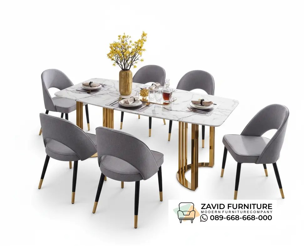 Daya tarik utama Meja Makan Jepang ini adalah meja makannya yang menawan. Permukaan meja (Top Table) terbuat dari material marmer tebal 1,2 cm yang kokoh dan menampilkan motif marmer putih yang mewah dan elegan (seperti terlihat pada gambar). Material marmer dikenal relatif tahan gores, tahan panas, dan mudah dibersihkan, menjadikannya pilihan ideal untuk meja makan. Meja ditopang oleh rangka kaki dari bahan stainless dengan warna gold untuk memberikan tampilan yang lebih mewah pada ruang makan.