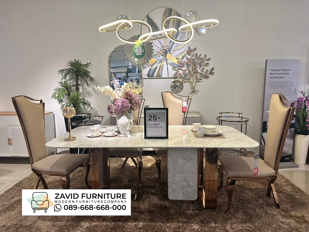 Meja makan marmer 6 kursi menjadi pilihan sempurna untuk Anda yang ingin menghadirkan nuansa mewah dan modern dalam ruang makan. Dengan permukaan marmer yang elegan dan enam kursi yang nyaman, set meja makan ini tidak hanya menawarkan keindahan visual, tetapi juga kenyamanan untuk menikmati setiap momen makan bersama keluarga atau tamu. Desain yang klasik namun kontemporer, menjadikan meja makan ini cocok untuk berbagai gaya interior, dari yang minimalis hingga yang modern bahkan rustik.