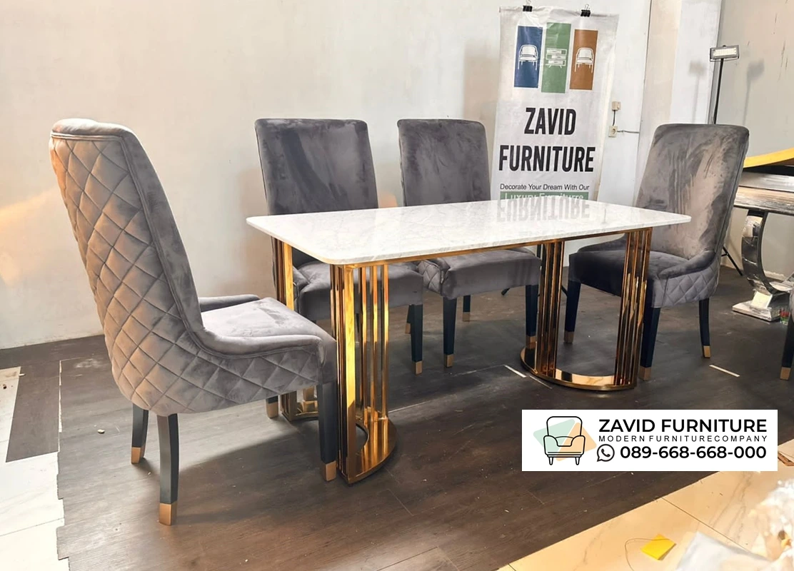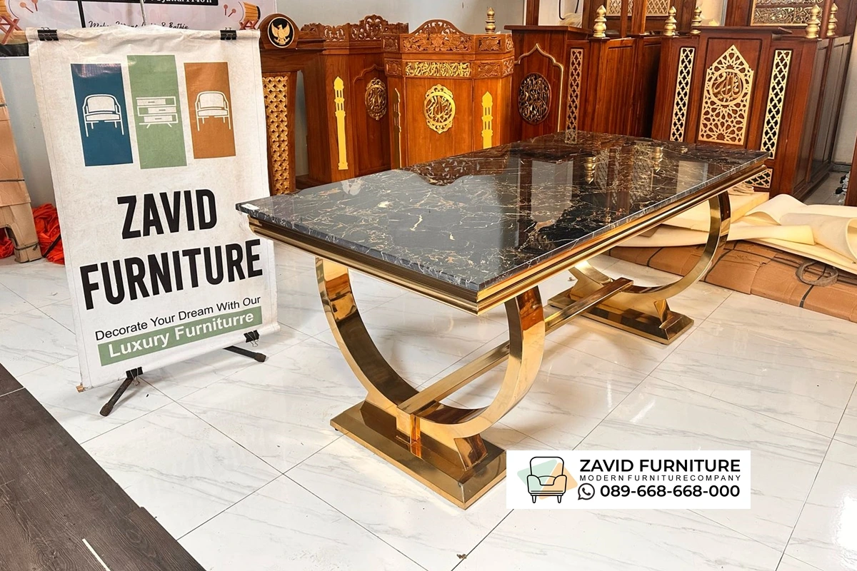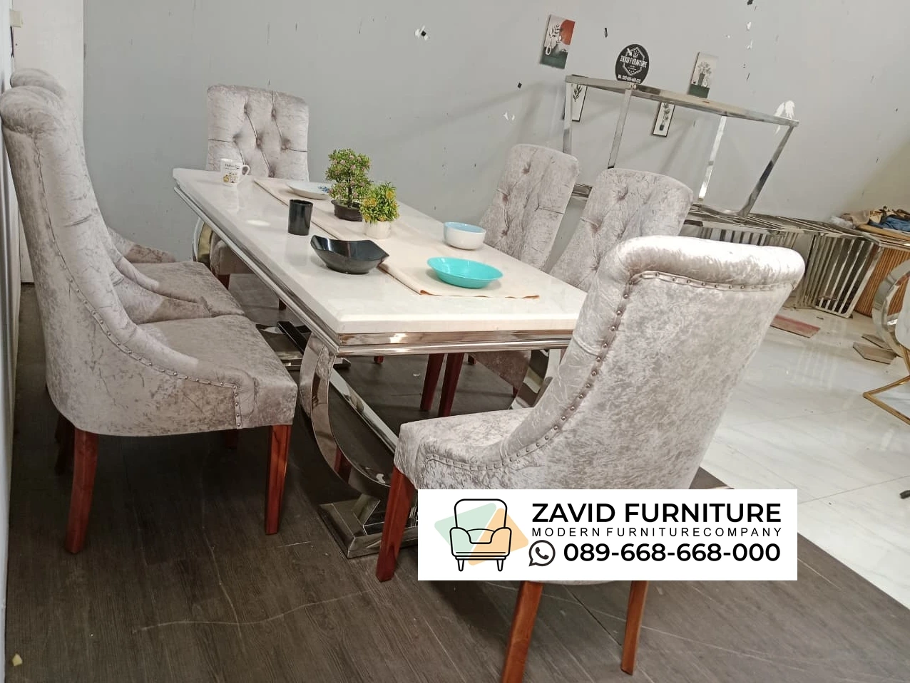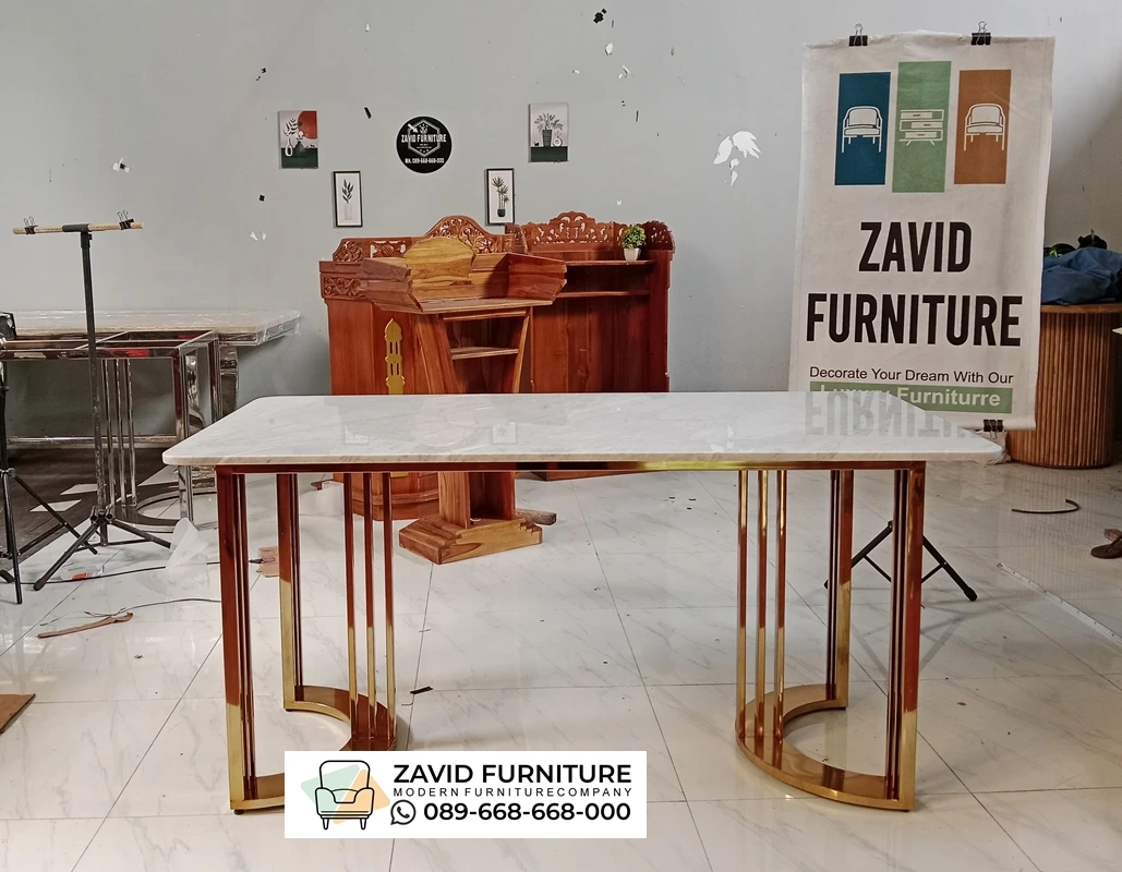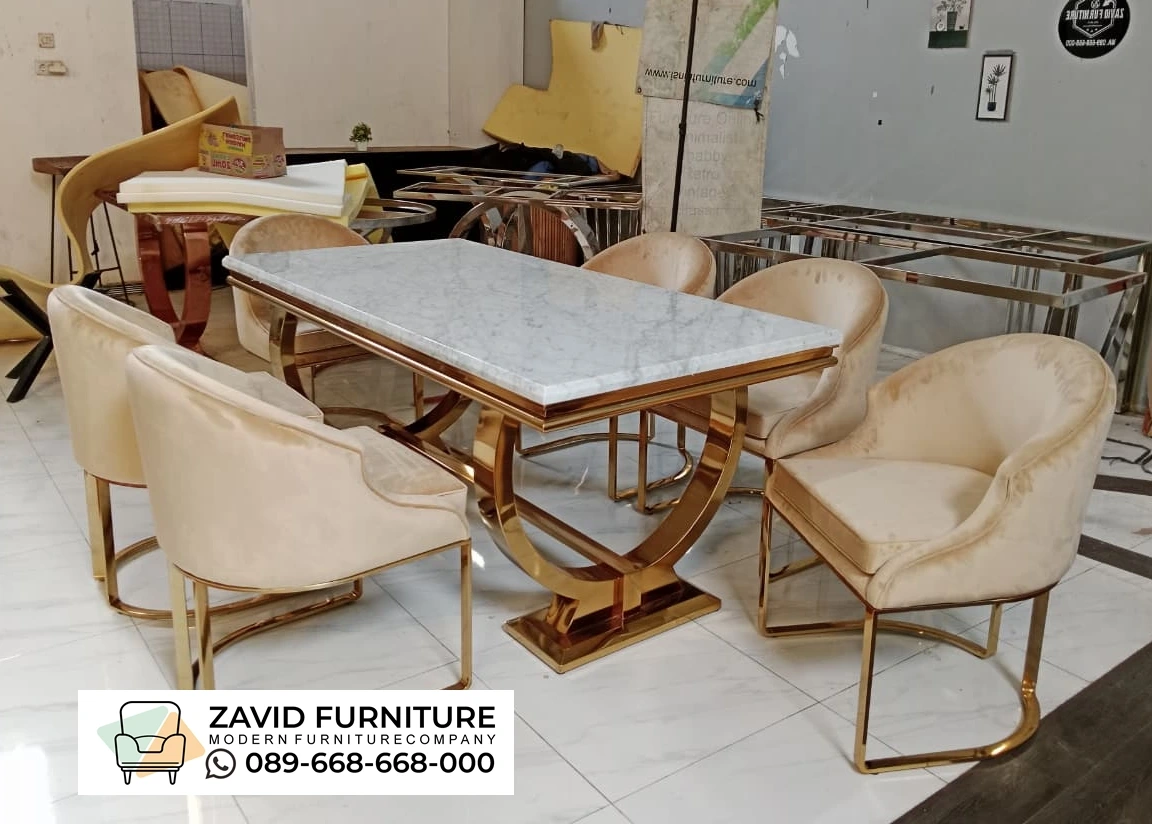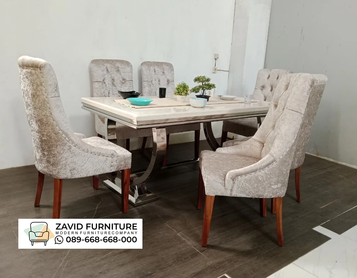 Yang membuat meja makan ini semakin istimewa adalah kombinasi kaki kayu dan stainless steel yang dirancang dengan presisi. Kaki kayu menghadirkan kesan hangat, natural, dan klasik, sementara elemen stainless steel menambahkan sentuhan modern dan mewah. Gabungan dua material ini menciptakan harmoni antara keindahan alam dan kemajuan desain kontemporer. Selain menambah keindahan, kaki meja ini juga memberikan kestabilan dan kekuatan yang luar biasa mampu menopang beban marmer dengan kokoh tanpa mengurangi nilai estetika.