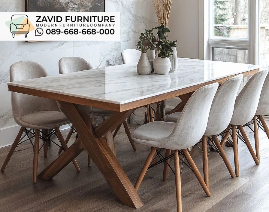 Meja Makan Marmer Scandinavian Kayu Silang