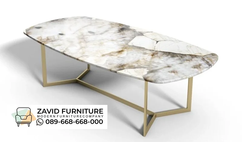 Memiliki struktur geometris yang unik (bentuk Y atau tripod yang saling terhubung), memberikan stabilitas maksimum sekaligus estetika modern yang minimalis. Kombinasi marmer putih/cream dengan kaki emas sangat diminati untuk interior yang bergaya glamour atau modern classic.