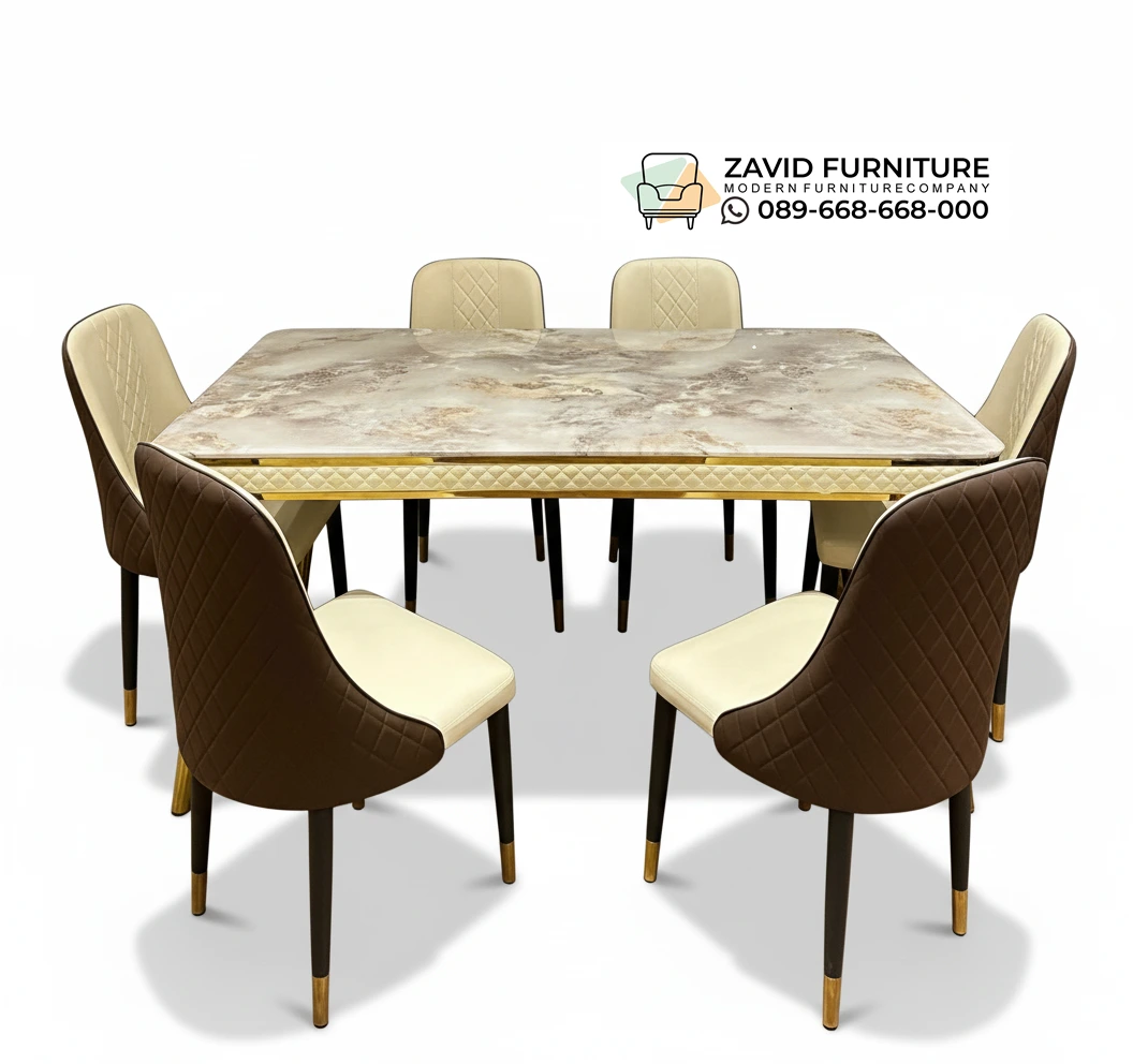 Material utama meja ini menggunakan marmer asli berkualitas tinggi yang memiliki keindahan serat alami dan permukaan berkilau Kombinasi marmer dengan kaki stainless steel membuat meja ini terlihat semakin modern dan kuat. Stainless yang digunakan adalah tipe tebal dan anti karat, dengan finishing yang elegan. Permukaannya yang halus, dingin, dan mengilap menjadikan meja tampak bersih, premium, dan berkelas. Marmer juga dikenal sangat tahan panas, tahan gores, dan mudah dibersihkan, sehingga cocok untuk penggunaan intens setiap hari.