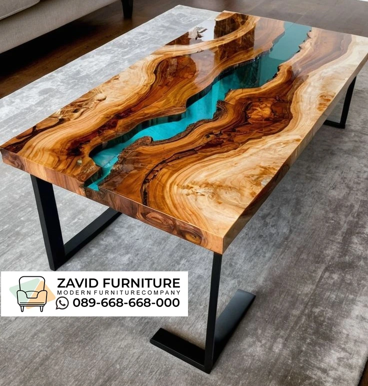Ini adalah kombinasi yang sempurna antara kayu solid yang berkualitas dan resin biru jernih yang elegan. Setiap meja memiliki pola serat kayu yang berbeda-beda, jadi tidak akan ada dua meja yang persis sama di mana pun. Ini adalah investasi yang membuat rumah Anda terlihat lebih mewah.