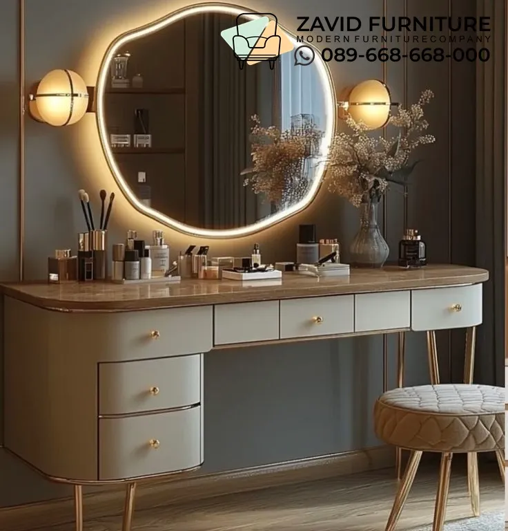 Kombinasi sempurna antara gaya minimalis modern dengan elemen mewah, Meja Rias Kaki Stainless Estetik ini dirancang untuk memberikan kenyamanan maksimal saat Anda bersiap menghadapi hari.Menggunakan material berkualitas tinggi, meja ini memiliki kaki kayu solid yang kuat dan tahan lama, serta permukaan halus yang mudah dibersihkan. Dilengkapi dengan cermin besar yang memiliki pencahayaan LED di belakangnya (Glow Effect), sehingga memancarkan cahaya yang merata dan lembut di wajah, sangat ideal untuk kegiatan make-up yang presisi. Meja ini juga dilengkapi dengan kursi (stool) minimalis yang empuk, senada dengan desain meja.