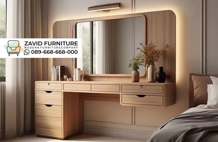 Meja rias ini benar-benar menggambarkan “fungsi yang estetis. ” Kombinasi tekstur kayu alami dan desain yang bersih sangat cocok untuk kamar dengan gaya Skandinavia atau Minimalis.