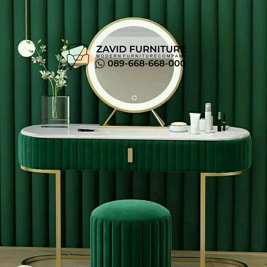 Kombinasi sempurna antara gaya minimalis modern dengan elemen mewah, meja ini dirancang untuk memberikan kenyamanan maksimal saat Anda bersiap menghadapi hari.Menggunakan material berkualitas tinggi, meja ini memiliki kaki kayu solid yang kuat dan tahan lama, serta permukaan halus yang mudah dibersihkan. Dilengkapi dengan cermin besar yang memiliki pencahayaan LED di belakangnya (Glow Effect), sehingga memancarkan cahaya yang merata dan lembut di wajah, sangat ideal untuk kegiatan make-up yang presisi. Meja ini juga dilengkapi dengan kursi (stool) minimalis yang empuk, senada dengan desain meja.