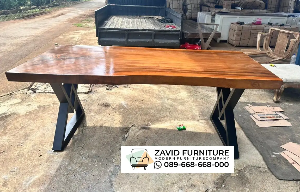 Sekarang ini meja makan dapat ditemui dengan berbagai jenis bahan dan ukuran yang bervariasi, untuk meja makan dengan ukuran yang besar dan utuh anda dapat menggunakan meja dari bahan kayu utuh dengan kayu jati atau  kayu trembesi dengan ukuran besar.  Meja Trembesi Solid Kaki Besi yang kami buat ini terbuat dari balok kayu trembesi yang berkualitas dan dibuat dengan tenaga ahlinya sehingga tidak abal abal ya gaiss. Dengan bahan baku trembesi utuh tanpa ada sambungan serta  model produk yang besar tentunya akan membuat pelanggan anda terasa nyaman dan puas. Tak hanya direstoran saja tapi bisa anda gunakan di rumah anda sebagai pemercantik ruangan makan anda.