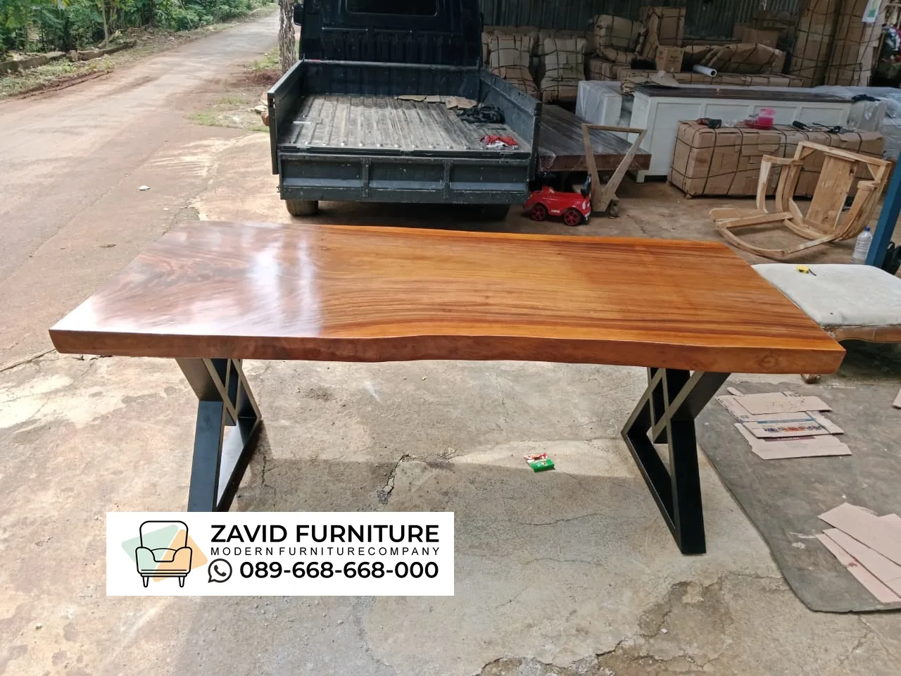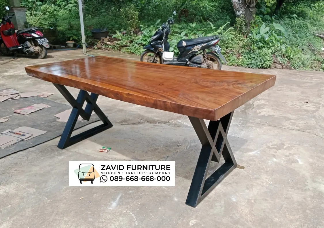 Bagian kakinya menggunakan rangka besi kuat yang melalui proses finishing powder coating. Kaki besi ini memberikan stabilitas luar biasa, tahan karat, dan menambah karakter industrial modern pada meja. Kombinasi trembesi solid dan kaki besi menciptakan kesan mewah, gagah, dan modern di berbagai jenis ruangan—baik rumah minimalis, kafe bergaya industrial, maupun kantor dengan konsep kontemporer.