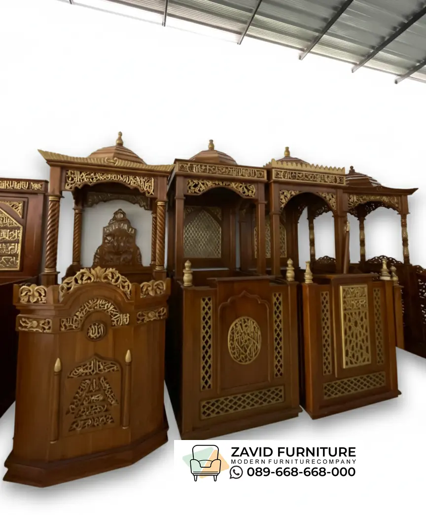 Biasanya, mimbar masjid terbuat dari kayu jati, mahoni, atau perpaduan antara ukiran logam dan marmer untuk memberikan penampilan yang megah dan solid. namun kali ini kami membuat Mimbar Masjid Bondowoso dengan bahan Kayu jati sering dipilih sebagai bahan utama karena ketahanannya yang sangat baik, pola seratnya yang menarik, serta warna alaminya yang hangat. Selain tahan terhadap serangan rayap dan kelembapan, kayu jati juga menciptakan suasana klasik dan berkarisma yang cocok dengan gaya interior masjid.