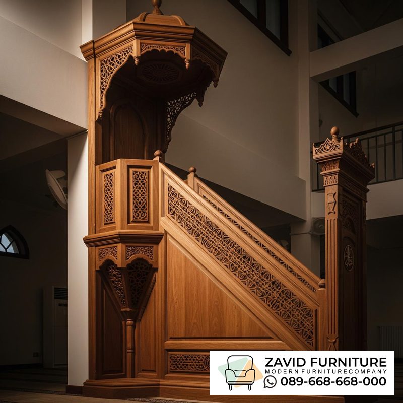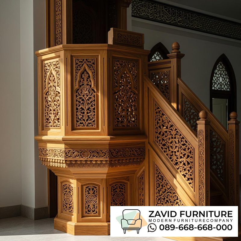 Mimbar masjid menjadi sebuah furniture yang paling penting berada di masjid. mimbar masjid dapat memamcarkan keagungan yang dapat membuat jamaah merasa lebih nyaman dan khusuk saat menjalankan ibadah terutama saat mendengar khutbah yang disampaikan. mimbar masjid seringkali dihiasi dengan ukiran mewah berupa motif islami berupa ayat al- qur’an atau tumbuhan. Mimbar Masjid Mewah ini memiliki desain yang mewah namun tetap mempertahankan nuansa kesakralan, mimbar ini hadir dengan ukiran kaligrafi yang indah dan detail. Setiap mimbar dihiasi dengan ukiran motif Islam yang khas, termasuk kaligrafi dan motif geometris. Setiap ukiran dan finishing dikerjakan oleh pengrajin profesional, menjadikan mimbar ini karya seni yang sangat indah dan detail. Atap kubah yang elegan berpadu dengan ukiran khas yang menambah nilai sejarah dan spiritualitas masjid. Setiap detail dari ukiran halus hingga finishing sempurna, mencerminkan dedikasi kami untuk memberikan kualitas terbaik sehingga mimbar masjid yang satu ini memang pantas dijukuki sebagai mimbar masjid paling mewah.