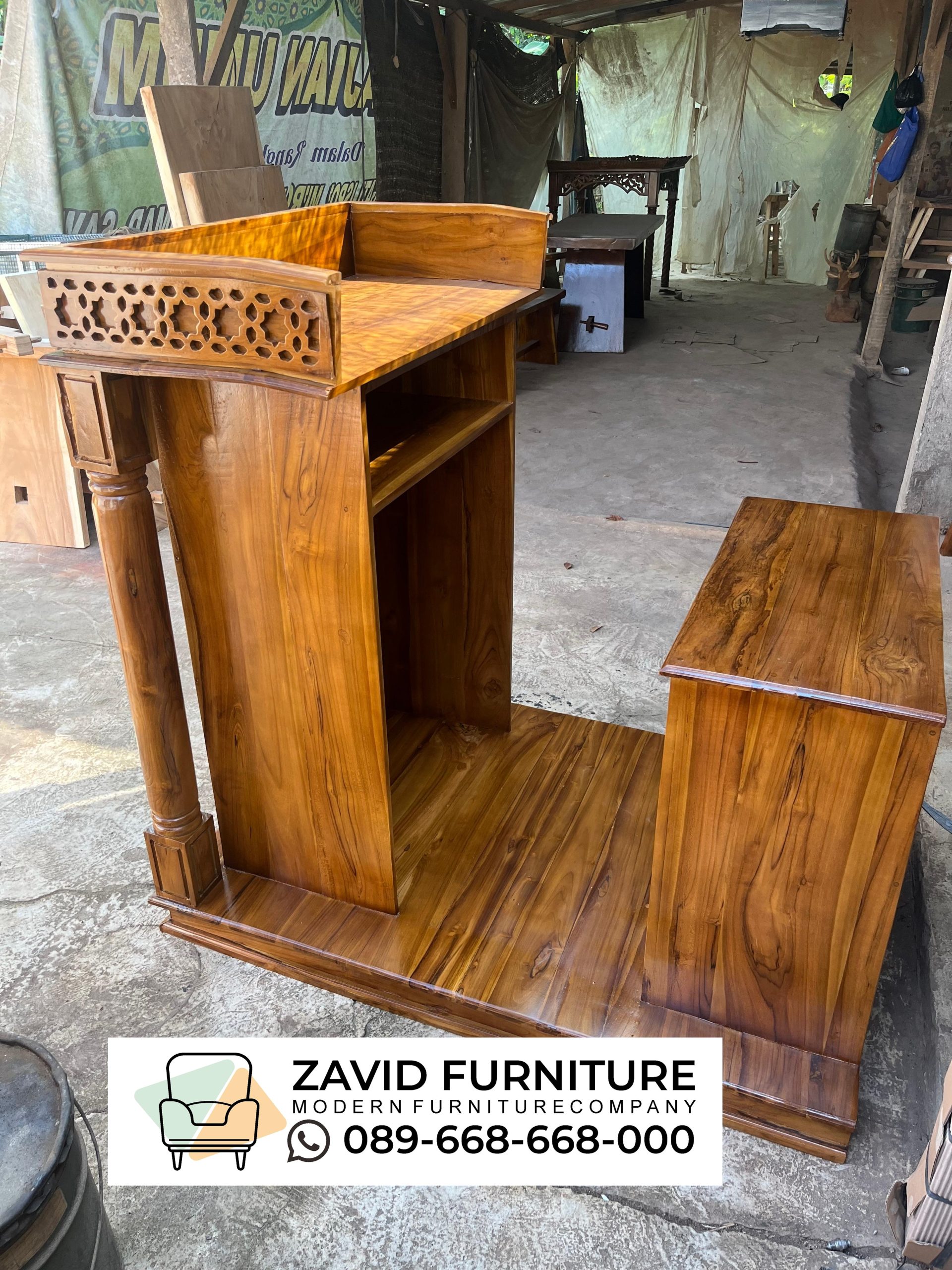 Sekarang banyak mimbar masjid yang terbuat dari berbagai bahan dan berbagai model, Kami menghadirkan berbagai produk mimbar masjid yang berkualitas tinggi salah satunya yaitu Mimbar Masjid Minimalis Dudukan. Desain minimalisnya membuatnya cocok untuk berbagai gaya interior masjid modern, sementara dudukan memberikan kenyamanan bagi khotib saat berbicara. Mimbar dirancang dengan garis-garis bersih dan sederhana, tanpa hiasan yang berlebihan, sehingga cocok untuk interior masjid yang modern. Mimbar masjid ini terbuat dari bahan kayi jati yang memiliki banyak kelebihan. Model ini memberikan kenyamanan bagi khutbah karena adanya tempat duduk, sehingga imam tidak perlu berdiri terus menerus. Desain minimalis juga membuat mimbar terlihat lebih bersih, rapi, dan modern, cocok untuk berbagai gaya masjid. Desain minimalis cenderung membuat ruang lebih terbuka dan luas. Mimbar minimalis dengan dudukan mudah dibersihkan dan dirawat.