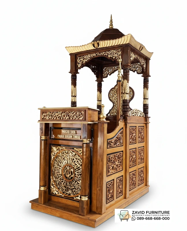 Namun, sejalan dengan perkembangan zaman, mimbar masjid kini hadir dalam berbagai desain, dari yang sederhana hingga yang mewah lengkap dengan kubah. Mimbar Masjid Padangsidimpuan dirancang dengan ketinggian yang cukup dan dihiasi ornamen islami, seperti ukiran kaligrafi atau pola geometris, terbuat dari kayu jati. Kayu jati memiliki ketahanan alami terhadap kondisi cuaca yang ekstrem, seperti hujan dan sinar matahari langsung, berkat kandungan minyak alami serta tanin yang berfungsi sebagai pelindung dan pengawet. Zat-zat ini juga membuatnya kurang rentan terhadap serangan rayap dan pembusukan, sehingga sangat ideal untuk digunakan sebagai bahan pembuatan mimbar dan podium masjid yang dapat bertahan lama dengan finishing berwarna emas.