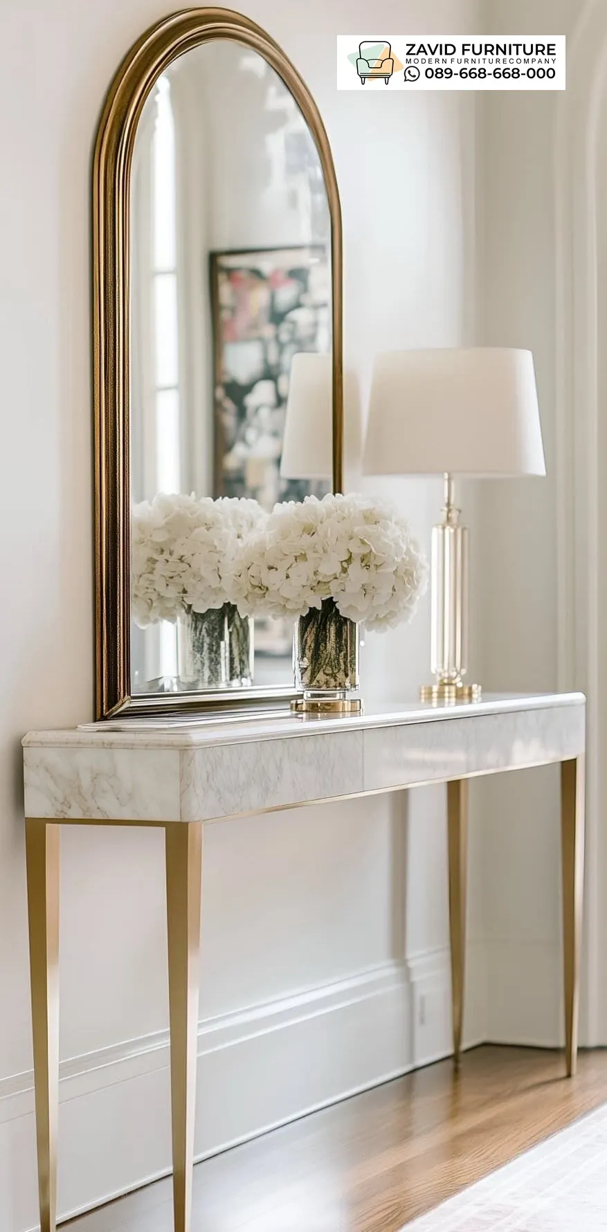 Meja konsul terbuat dari marmer yang terkenal kuat, tahan lama, dan memiliki serat pola warna yang indah, dengan dipadukan kaki meja dari stainless gold berbentuk unik yang memberikan kesan mewah dan tahan karat, serta memberikan kesan kokoh pada meja. Meja ini juga bisa digunakan untuk meletakkan barang-barang dekoratif, seperti vas bunga, lampu meja, atau bingkai foto.