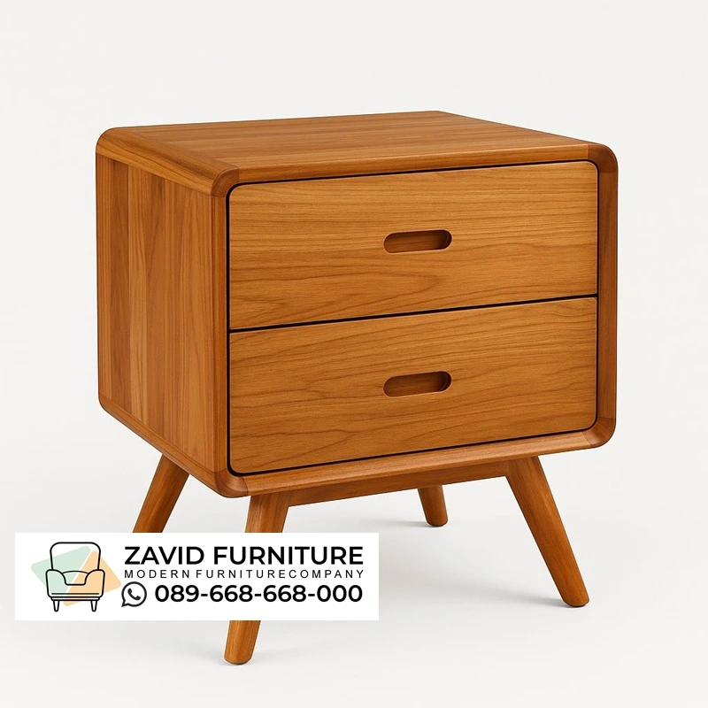 Selain berfungsi sebagai tempat untuk meletakkan lampu dan ponsel, nakas ini juga dapat berperan sebagai hiasan artistik yang memperindah ruangan tidur. Nakas ini memiliki dua laci yang cukup besar untuk menyimpan buku, peralatan elektronik, atau barang-barang pribadi, sehingga membantu menjaga kerapihan kamar. Nakas jenis ini sangat ideal jika dipadukan dengan dipan kayu minimalis atau dinding dengan warna pastel atau netral, guna menonjolkan gaya interior skandinavia atau retro.