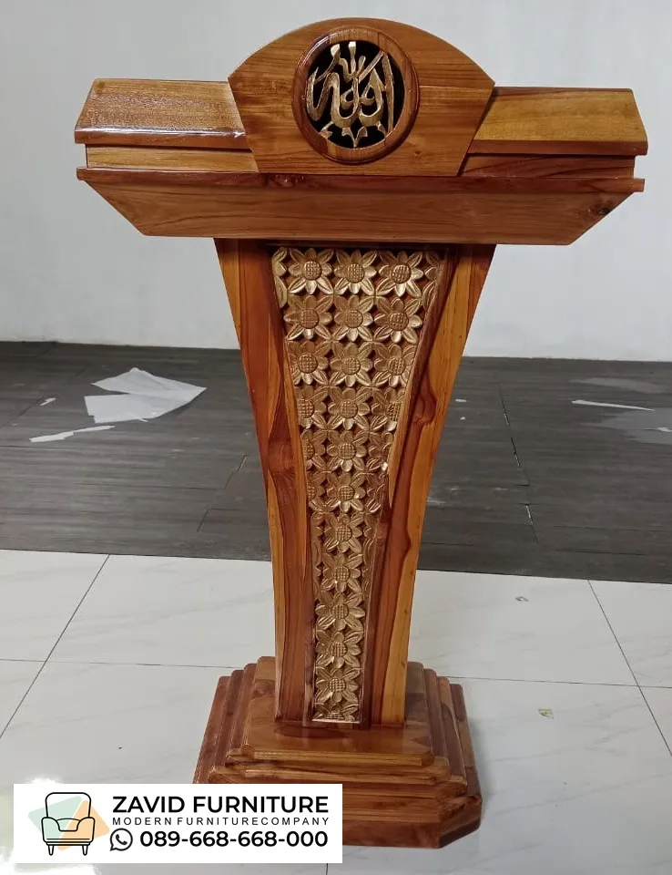 Material unggulan yang mampu bertahan puluhan tahun tanpa mengalami kerusakan salah satunya kayu jati, Setiap podium ceramah kayu jati dibuat dengan rangka solid sehingga stabil dan tidak mudah goyah saat digunakan. Finishing halus menambah kesan eksklusif, cocok untuk acara formal maupun keagamaan.