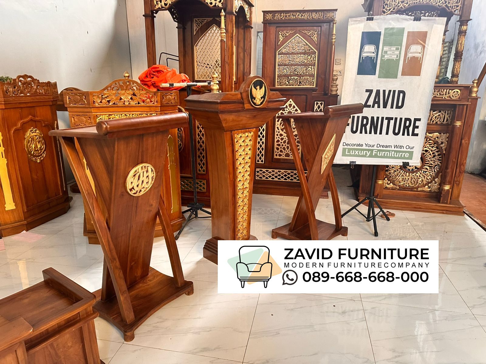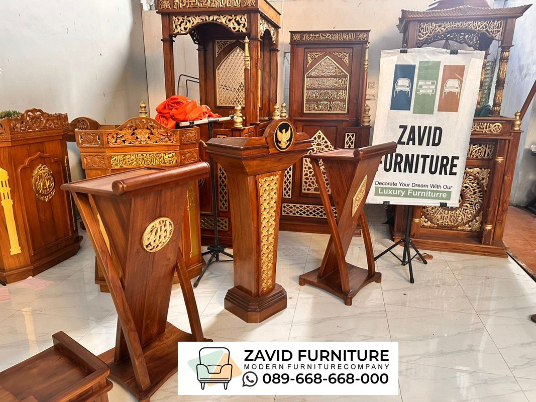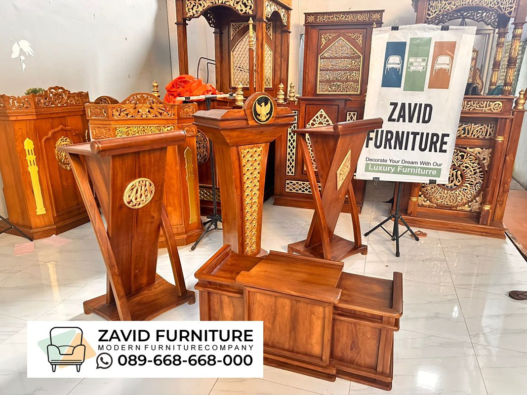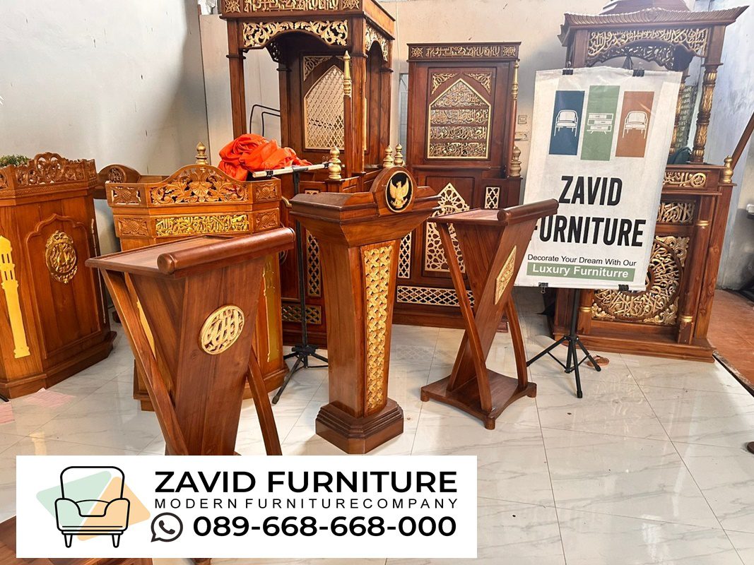 Dizaman yang semakin modern sekarang sepertinya sudah banyak masyarakat yang lebih tertarik dengan furniture yang memiliki desain simple serta tidak memiliki onamen yang berlebihan agar dapat dengan mudah di cocok kan dengan segala desain interior ruangan salah satunya yaitu dengan memilih produk Podium Minimalis tersebut. namun sebelumnya kami akan membahas sedikit tentang podium minimalis terlebih dulu jadi podium minimalis adalah furniture atau perabotan yang umum digunakan di sebuah masjid untuk tempat imam maupun khatib berkhutbah. podium umumnya dibuat dengan ukuran lebih pendek, simple dan hanya sedikit ukiran, bahkan untuk beberapa ada juga yang sama sekali tidak ada ukiran apapun atau polosan saja dengan model seperti ini imam atau khatib yang sedang berceramah akan lebih mudah untuk menjamah semua jamaah yang hadir tak terkecuali yang berada di baris terakhir sekalipun podium minimalis ini juga sering digunakan oleh tokoh-tokoh agama atau pejabat tinggi negara dalam menyampaikkan inforamasi khotbah atau pidato penting.