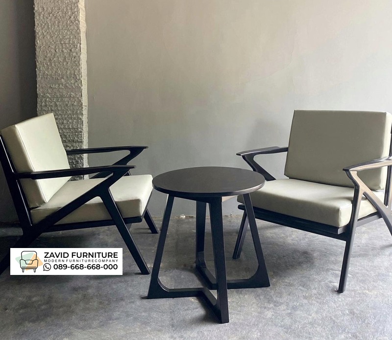 Kali ini kita kan menunjukkan produk set kursi teras minimalis. Set kursi teras ini menunjukkan gabungan gaya Mid-Century Modern dengan nuansa minimalis modern. Ini sangat ideal untuk orang-orang yang suka furnitur dengan garis yang jelas tetapi tetap terlihat anggun. Dibuat dari kayu solid dengan lapisan finishing berwarna dark espresso atau hitam matte. Warna gelap ini memberikan kesan kuat dan mewah. Set ini juga dilengkapi dengan bantal tebal berwarna abu-abu muda atau putih pucat. Perbedaan warna antara rangka yang gelap dan bantal yang cerah menciptakan tampilan yang bersih dan modern.