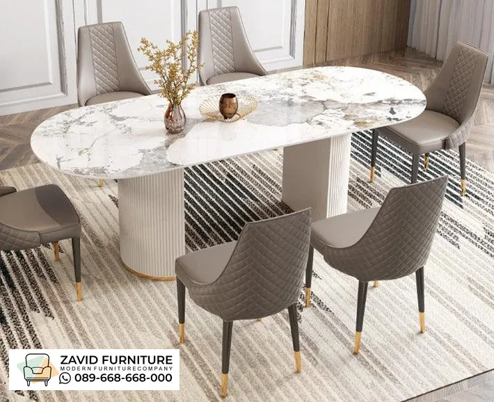 Set Meja Makan Marmer Oval merupakan meja makan marmer dengan bentuk oval sehingga aman untuk jangkauan anak-anak karena ujungnya tidak berberntuk tajam, Meja makan menjadi hal penting utama yang menentukan karakter ruang, baik dalam bentuk persegi panjang, bundar, maupun oval, dengan material seperti kayu jati, marmer, atau kombinasi besi minimalis dengan kursi yang nyaman serta pencahayaan yang hangat juga berperan besar dalam menciptakan suasana makan yang lebih menyenangkan. Dengan kombinasi kaki meja yang unik, meja ini menjadi lebih menarik.