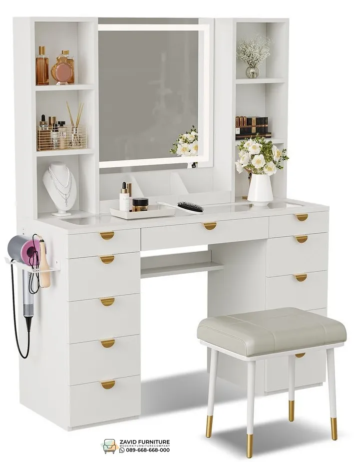 Set Meja Rias Minimalis Duco Putih dengan warna putih yang halus dan rata memberikan nuansa terang serta mudah dipadukan dengan berbagai konsep interior, baik minimalis maupun klasik. Dilengkapi cermin dan laci penyimpanan yang fungsional, meja rias duco putih tidak hanya menunjang aktivitas merias diri dengan nyaman, tetapi juga menambah nilai estetika ruangan secara keseluruhan.