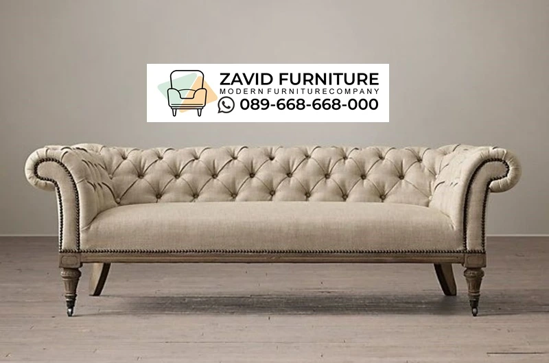 Rangka dan Kaki kayu yang diolah dengan baik dan dilengkapi aksen roda di bagian depan, menciptakan kesan furniture bergaya antik sekaligus memudahkan penggerakan sofa di atas karpet. Menggunakan bahan linen atau kanvas berwarna krem atau beige yang netral. Tekstur kain yang berfibra menampilkan kesan alami dan menciptakan suasana “sejuk”, yang sangat sesuai untuk gaya interior Farmhouse atau French Country.
